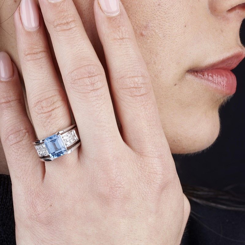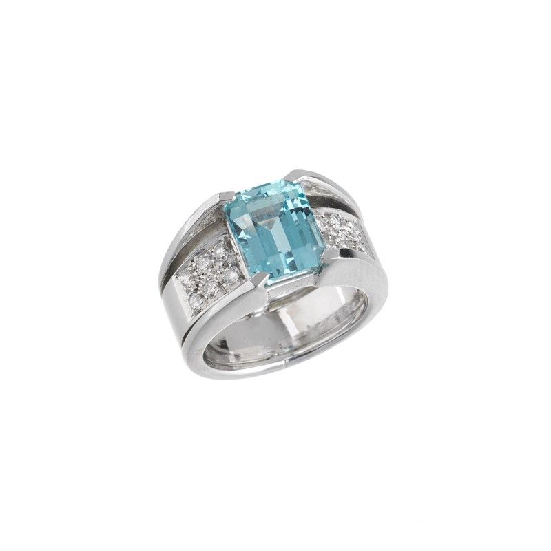 in oro bianco 18kt, con al centro un'acquamarina taglio ottagonale di ct 4 circa affiancata da diamanti per ct 0.30 circa, mis. 52, gr. 12