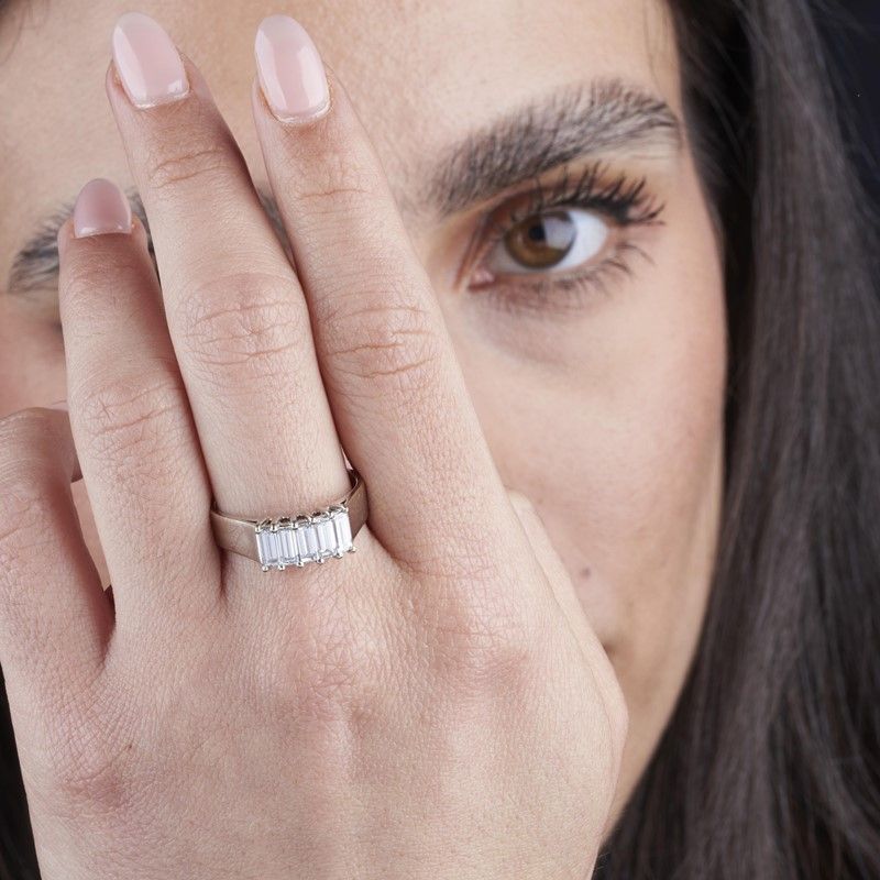 in oro bianco 18kt, impreziosito da cinque diamanti taglio baguette per ct 1.20 circa, punzone 750, mis. 60, gr. 7