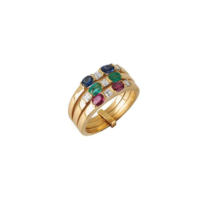 ANELLO A FASCIA CON PIETRE DI COLORE E DIAMANTI in oro giallo 18kt, composto da tre anelli impreziositi da zaffiri e rubini taglio ovale per ct 0.80 circa, due smeraldi taglio ovale per ct 0.30 circa e diamanti taglio carré per ct 0.60 circa, punzoni 750 e del fabbricante, mis. 57, gr. 10