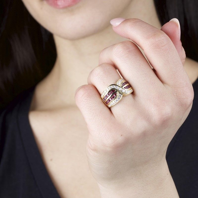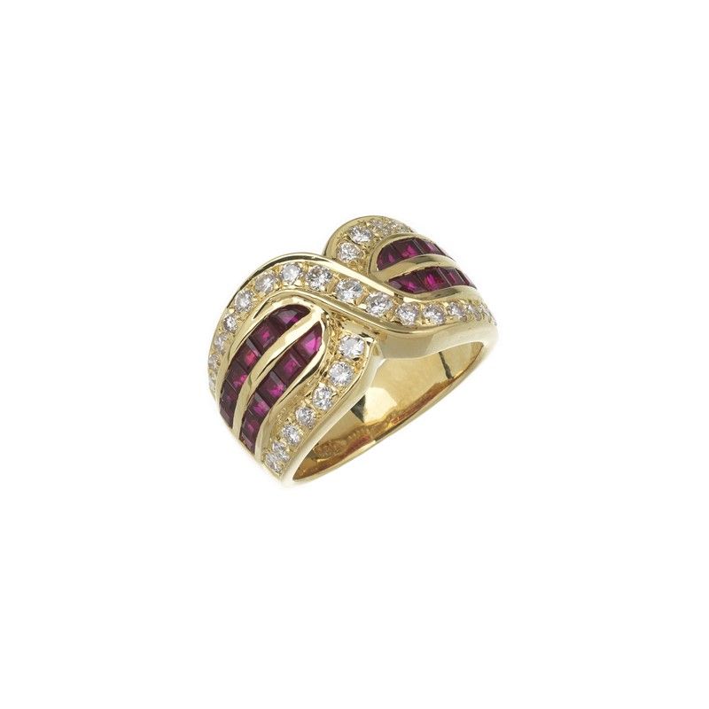 in oro giallo 18kt, impreziosito da una doppia fila di rubini taglio carré e diamanti taglio brillante per ct 2.10 circa raffiguranti al centro un motivo a intreccio, punzone 750, mis. 51, gr. 9