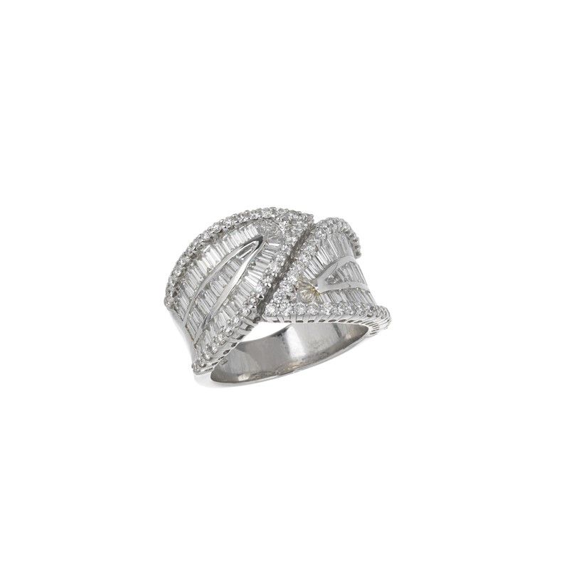 in oro bianco 18kt, impreziosito di diamanti taglio baguette, tapes e brillante per ct 2.60 circa, punzone 750, mis. 54, gr. 11
