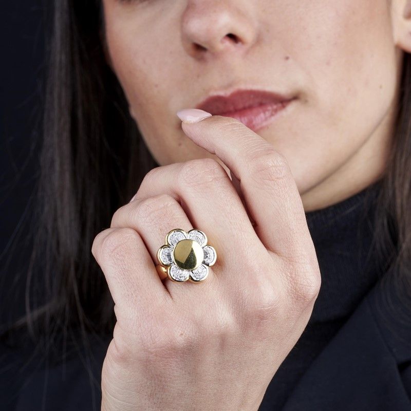 ANELLO A FORMA DI FIORE CON DIAMANTIin oro giallo e bianco 18kt, impreziosito da [..]