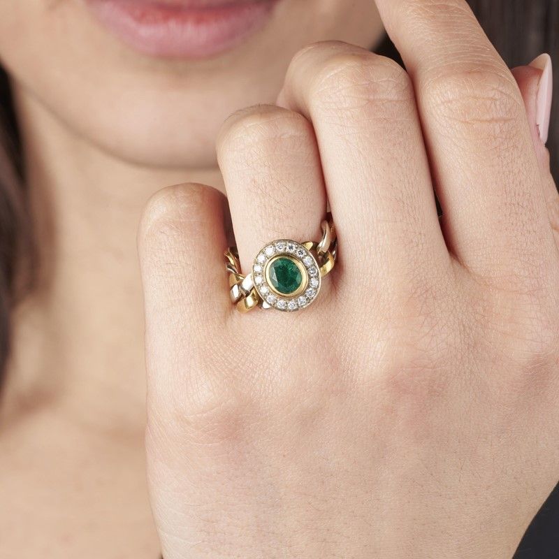 ANELLO A MAGLIA GROUMETTE CON SMERALDO E DIAMANTI in oro giallo e bianco 18kt, impreziosito da uno smeraldo taglio ovale di ct 0.60 circa circondato da una fila di diamanti taglio brillante per ct 0.30 circa, punzone 750, mis. 60, gr. 7