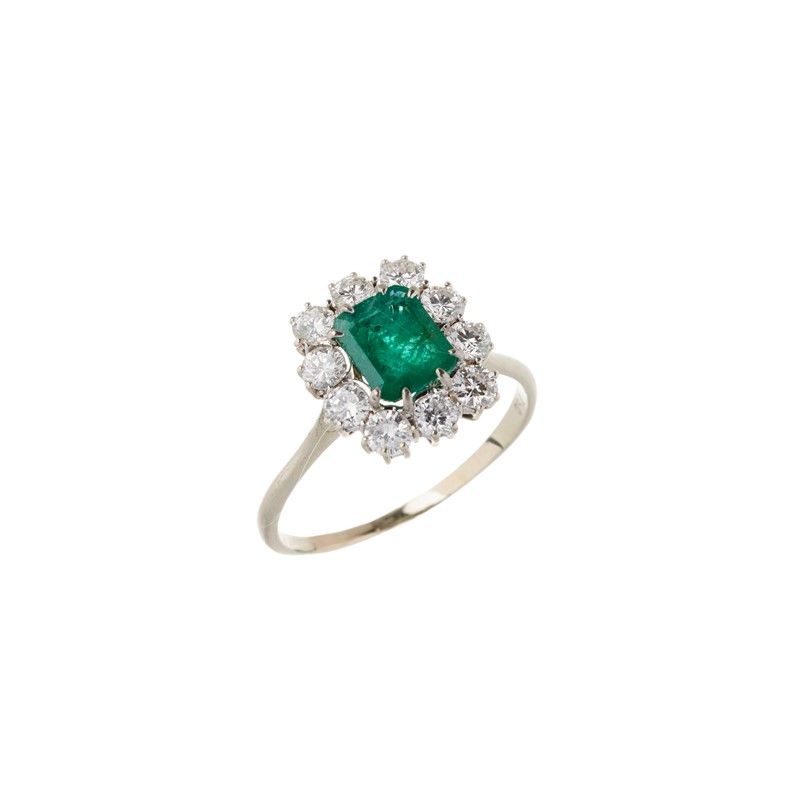 ANELLO A MARGHERITA CON SMERALDO E DIAMANTI in oro bianco 18kt, con al centro uno smeraldo taglio ottagonale di ct 1 circa, circondato da una fila di diamanti taglio brillante per ct 1.30 circa, punzone 750, mis. 61, gr. 3