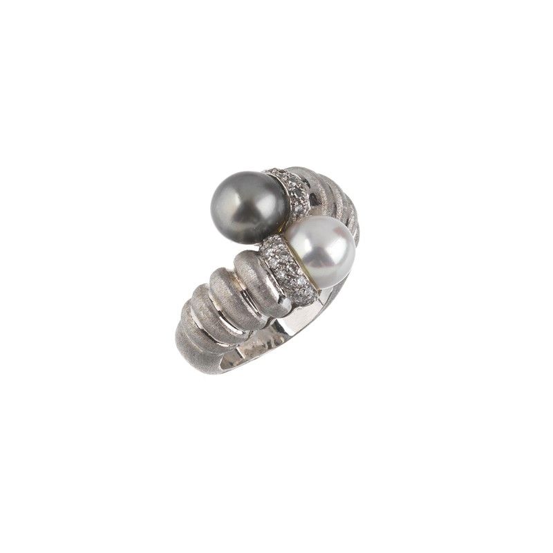 ANELLO CONTRARIE CON PERLE E DIAMANTI in oro bianco 18kt, dalla superficie scanalata e satinata, con agli apici una perla bianca e una grigia di mm 8 circa, impreziosito da diamanti taglio brillante per ct 0.50 circa, punzone 750, mis. 53, gr. 18