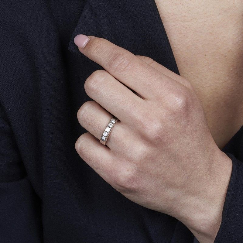 in oro bianco 18kt, impreziosito da cinque diamanti taglio brillante per ct 0.50 circa, punzone 750, mis. 53, gr. 3