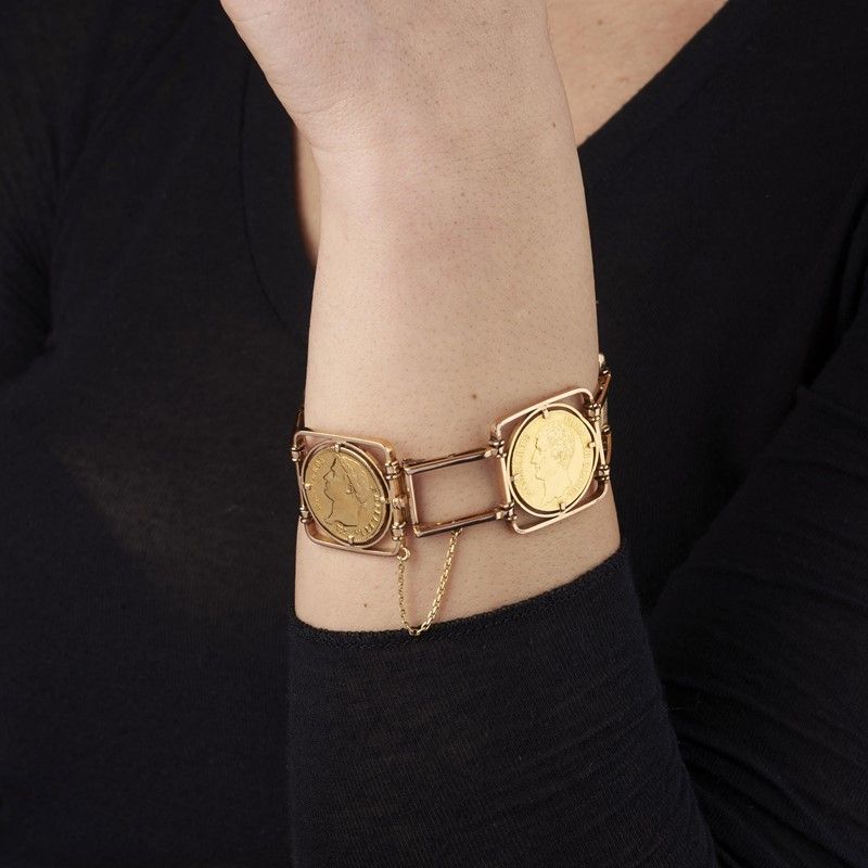 in oro giallo 18kt, composto da una serie di maglie concatenate quandrangolari recanti al centro delle monete da 20 franchi, punzone 750, lungh. cm 17 circa, gr. 54