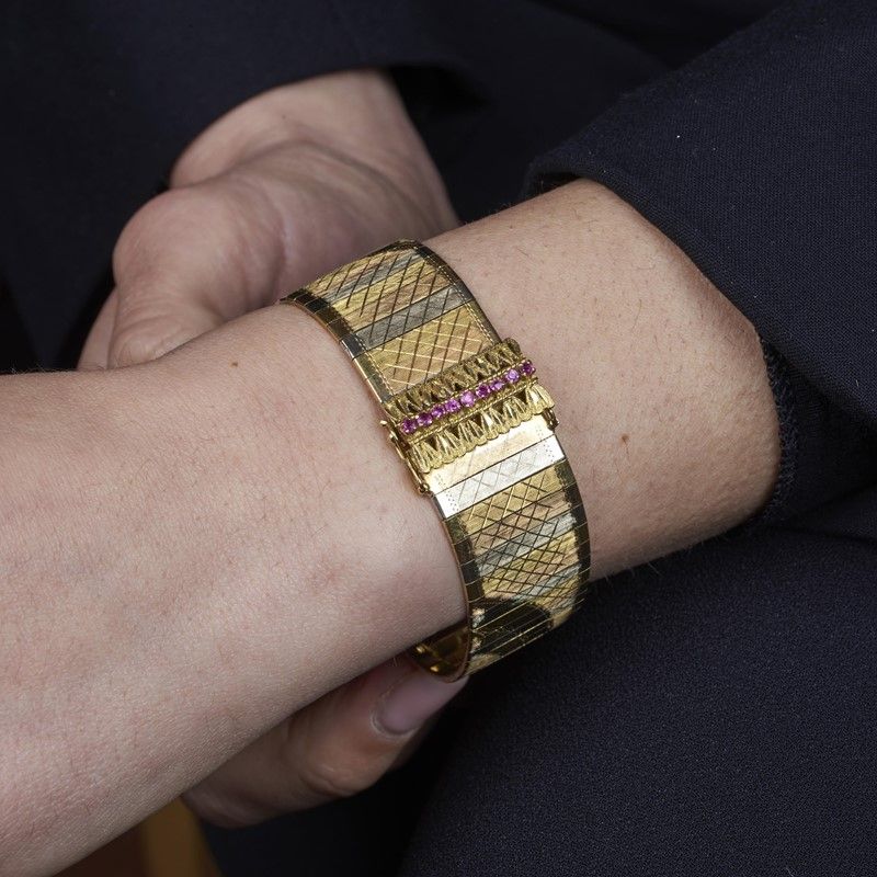 in oro giallo, bianco e rosa 18kt, con motivo figurato inciso, impreziosito sulla chiusura da rubini taglio rotondo per ct 0.30 circa, punzoni 750 e del fabbricante, lungh. cm 20, gr. 45