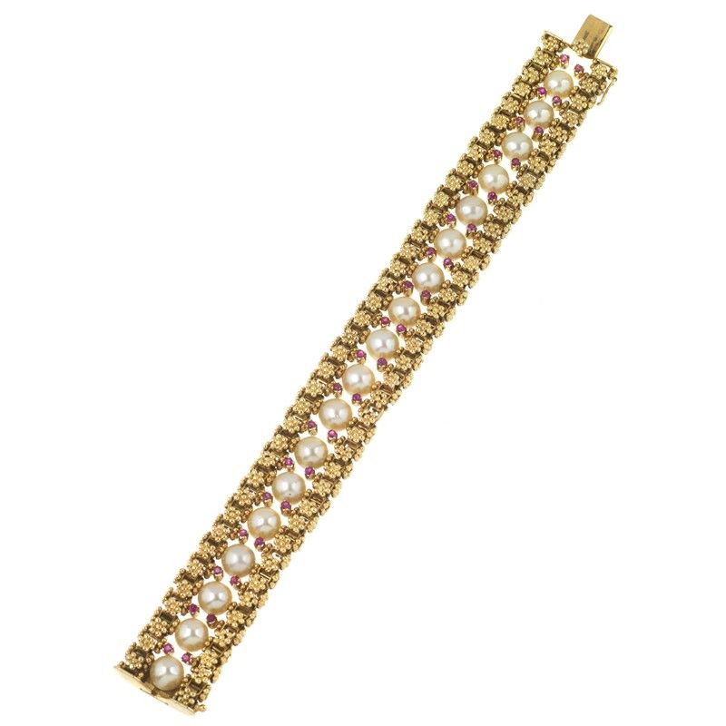 BRACCIALE A MAGLIA MORBIDA CON PERLE E RUBINI in oro giallo 18kt, realizzato a binario con al centro una fila di perle di mm 8 circa, alternate a coppie di rubini taglio rotondo per ct 1.20 circa, punzoni 750 e del fabbricante, lungh. cm 18,5, gr. 96