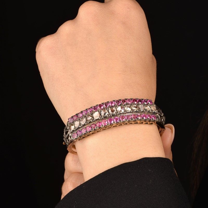 in oro e argento, impreziosito da una serie di rose di diamante cinta da una doppia fila di rubini taglio rotondo per ct 5 circa, punzone 750, dim. cm 6,5x6 circa, diam. interno cm 6 circa, gr. 28
