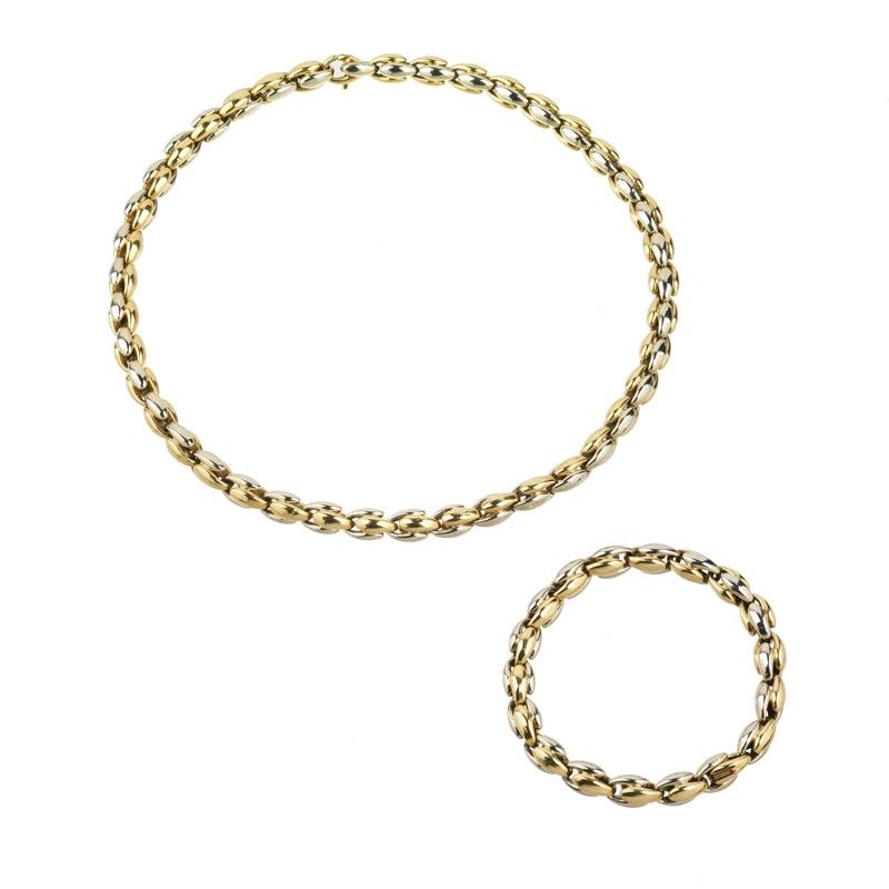 in oro giallo e bianco 18kt, firmati "Chimento", punzoni 750 e del fabbricante, lungh. collana cm 44, lungh. bracciale cm 20, gr. 68 complessivi
