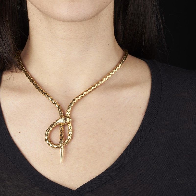 COLLANA A FORMA DI SERPENTE in oro giallo 18kt, realizzata a forma di lungo serpente attorcigliato, il corpo è lavorato ad immitazione della pelle coperta di squame, con testa impreziosita da rubini (uno mancante), punzoni 750 e del fabbricante, lungh. cm 41,5, gr. 37
