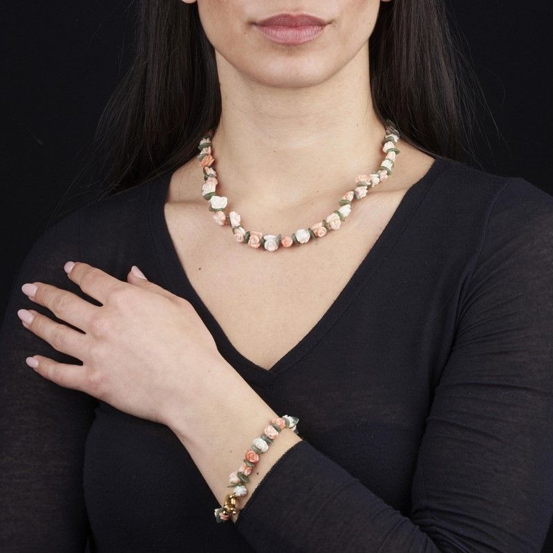 COLLANA CON BRACCIALE A FORMA DI GHIRLANDE realizzati ad un filo di rose in corallo rosa inciso, alternate a foglie in calcedonio verde, fermature a moschettone in oro giallo 18kt, punzone 750, lungh. collana cm 44 e bracciale cm 19, gr. 61 complessivi