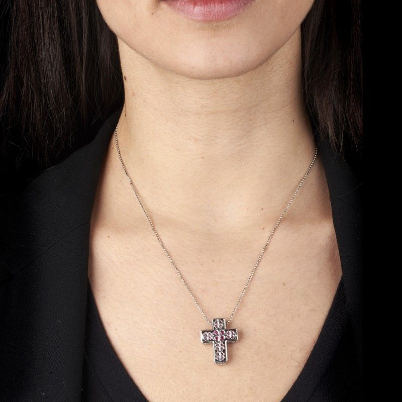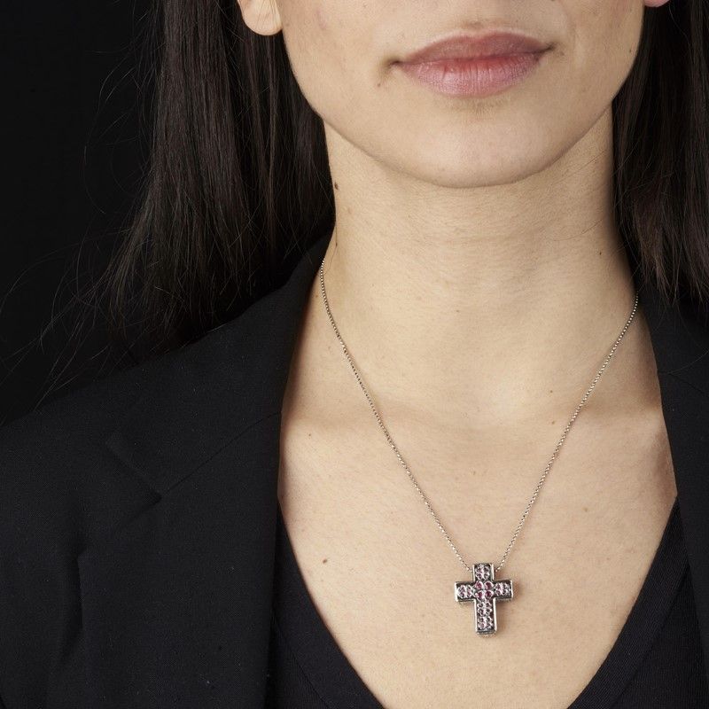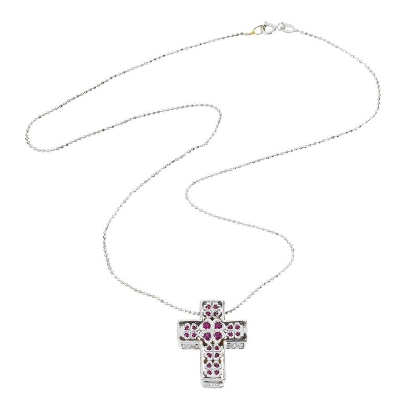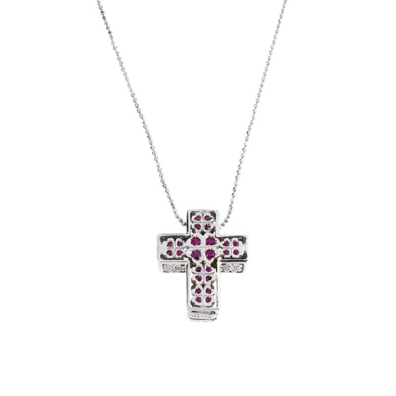 COLLANA CON PENDENTE A FORMA DI CROCE in oro bianco 18kt, con un ciondolo a forma di croce raffigurante dei quadrifogli impreziositi su un lato da diamanti taglio brillante per ct 0.30 circa, e nell'altro da rubini taglio rotondo per ct 0.30 circa, punzoni 750 e del fabbricante, lungh. cm 44,5, gr. 10