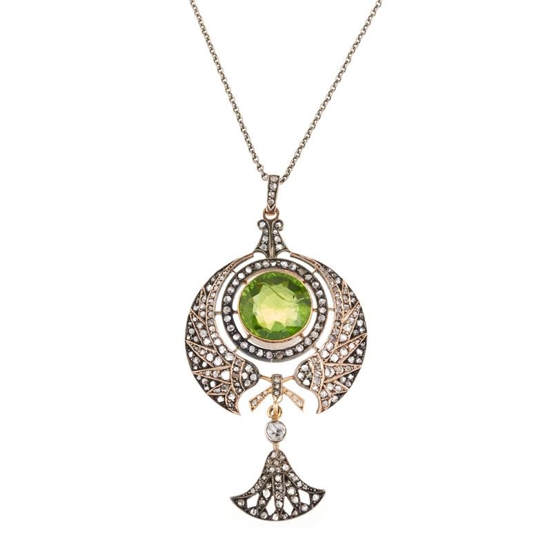 COLLANA CON PENDENTE STILE EGIZIANO in argento, da cui pende un ciondolo in oro a basso titolo e argento, raffigurante un disco solare alato, impreziositi da rose di diamante e una pietra verde al centro, lungh. cm 42, dim. pendente cm 3x6 circa, gr. 12. Corredata di scatola.