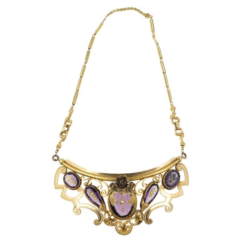 in oro a basso titolo, composta da catena e grande elemento centrale realizzato con motivi a volute e a tralci fioriti, impreziosito da ametiste taglio fantasia, lungh. cm 43,5, gr. 53