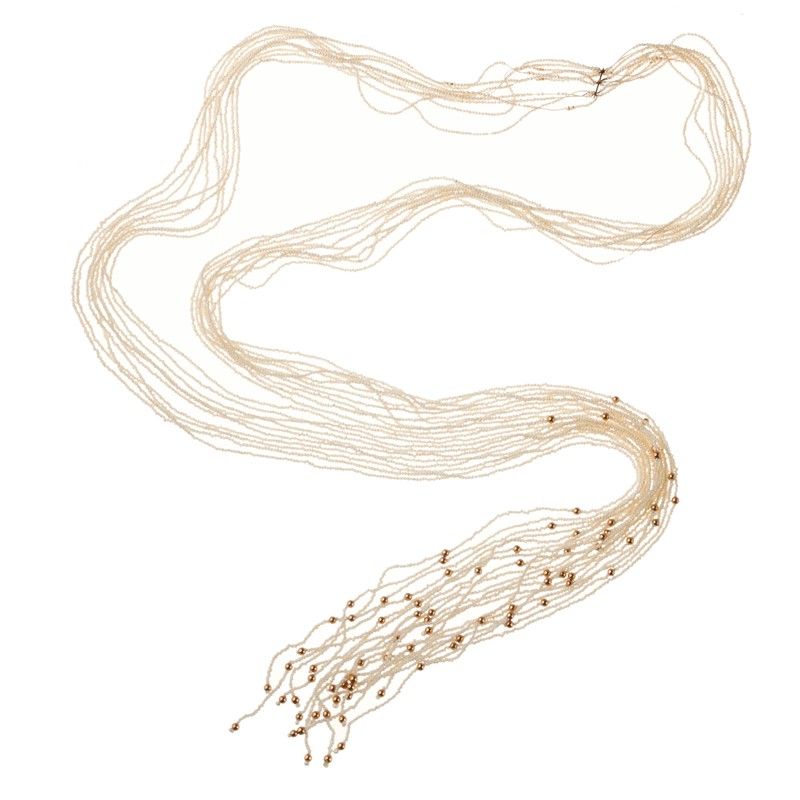 realizzata a fascia, composta da fili di microperle da intrecciare per farne una collana a sciarpa, lungh. cm 107, gr. 22