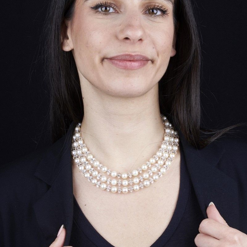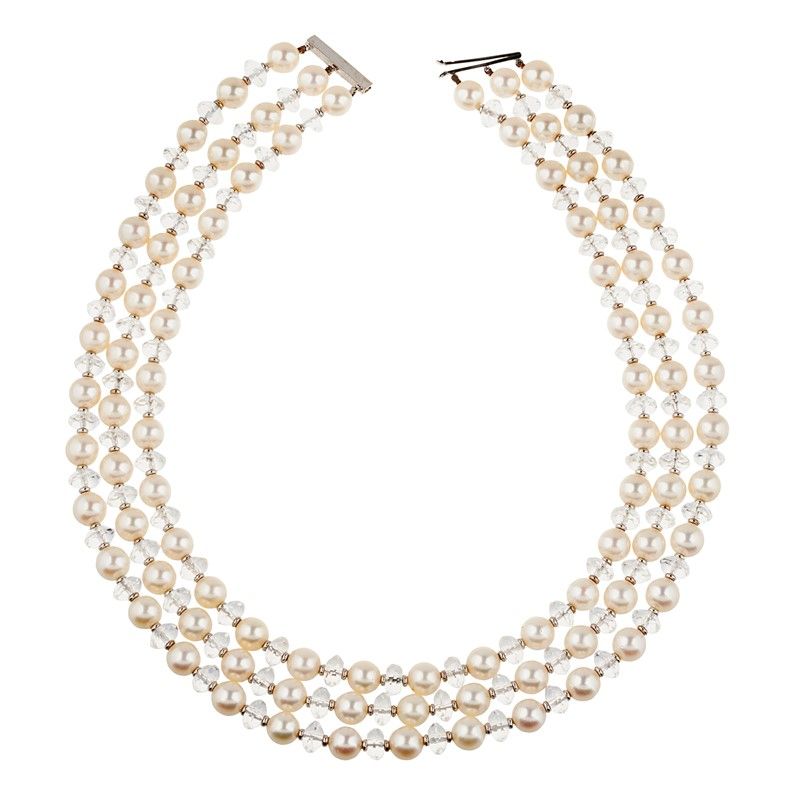 a tre fili di perle di mm 7 circa alternate a dischi in cristallo di rocca sfaccettati, fermatura in oro bianco 18kt, lungh. cm 41, gr. 118