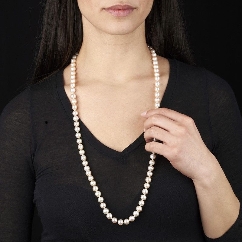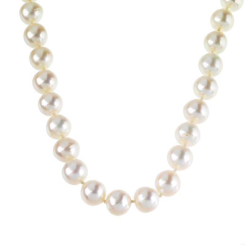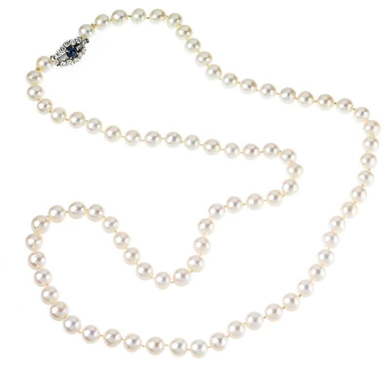 composta da un filo di perle di mm 9 circa, fermatura in oro bianco 18kt con al centro uno zaffiro taglio cabochon circondato da diamanti taglio brillante e baguette per ct 2 circa, lungh. cm 80, gr. 91