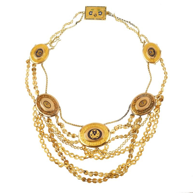 in oro a basso titolo, composta da una serie di catene pendenti composte da leggere maglie a foglia unite a elementi ovali cesellati e decorati in smalti policromi con raffigurati motivi floreali, lungh. cm 49, gr. 24