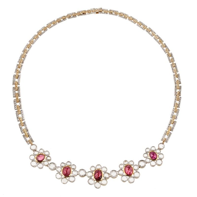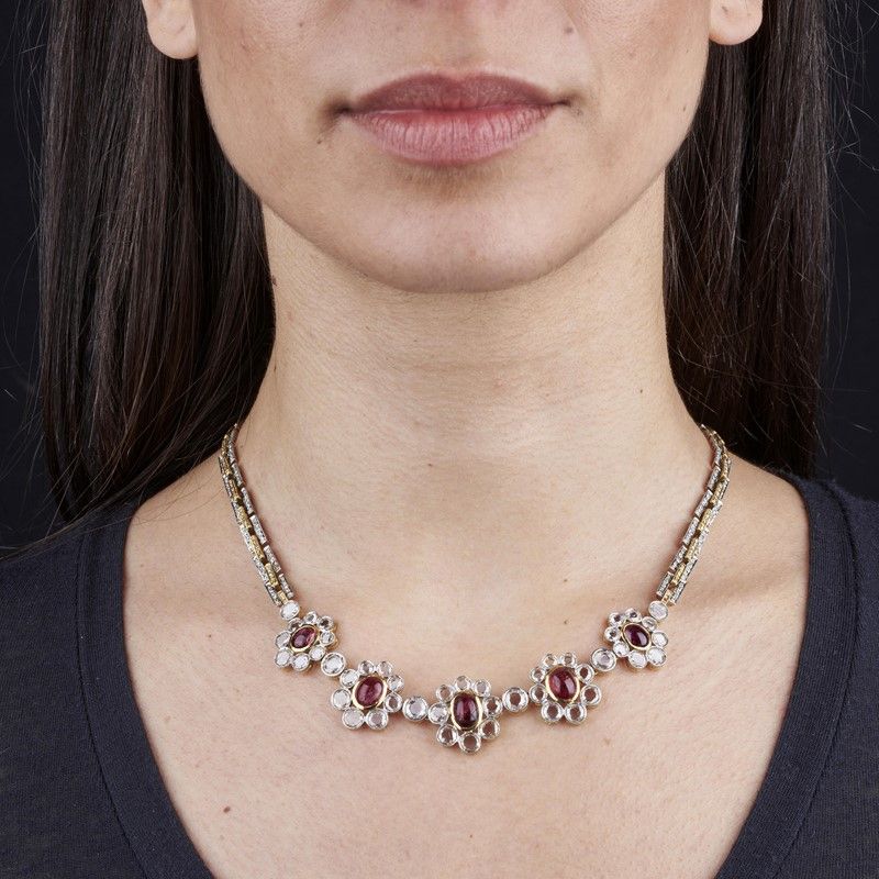 COLLANA FLOREALE in oro giallo e bianco 18kt, composta da una serie di maglie rettangolari concatenate, con parte centrale realizzata a forma di ghirlanda, impreziosita da cinque rubini taglio cabochon per ct 8 circa e diamanti taglio rotondo e huit huit per ct 8 circa, lungh. cm 44, gr. 50