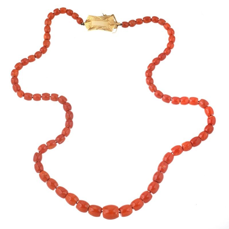 ad un filo di barilotti in corallo digradanti da mm 13x12 a mm 5x5 circa, fermatura in oro giallo 18kt, punzoni 750 e del fabbricante, lungh. cm 64, gr. 59