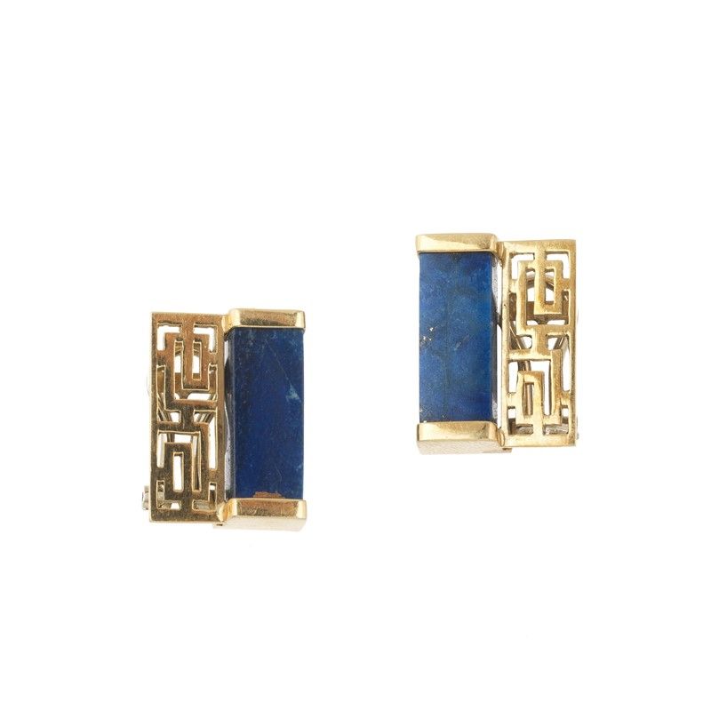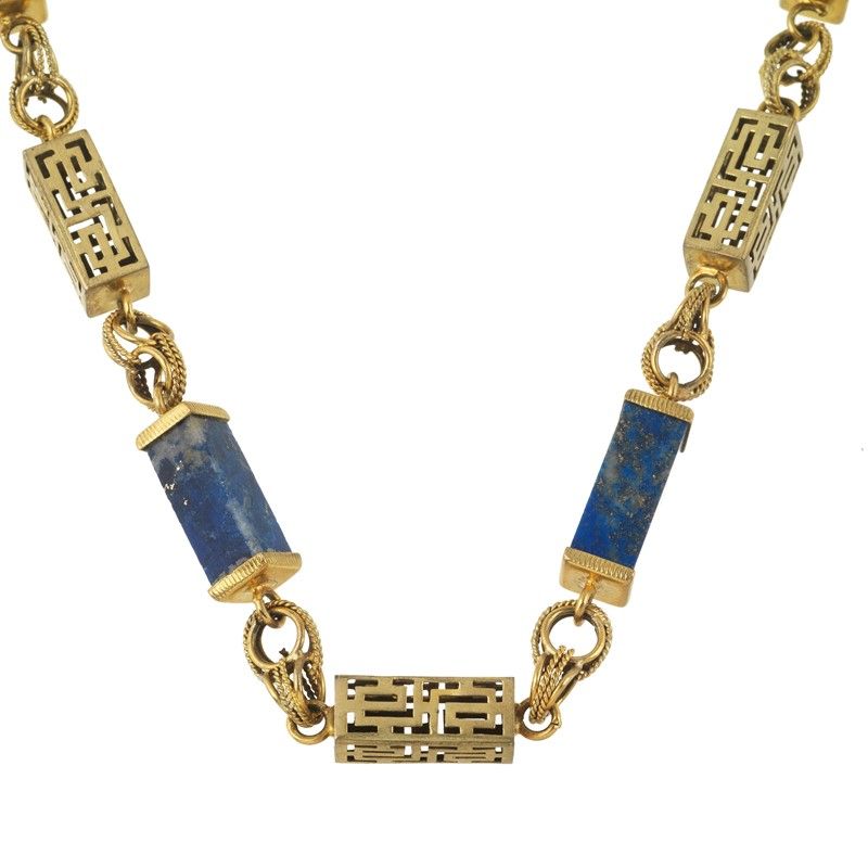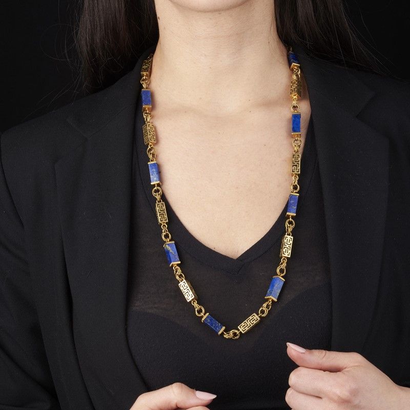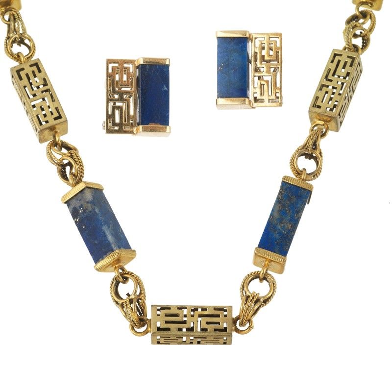 DEMI PARURE CON LAPISLAZZULI in oro giallo 18kt, composta da collana e paio di orecchini, collana realizzata a catena con una serie di elementi rettangolari traforati alternati a cilindri in lapislazzuli, lungh. cm 75, dim. orecchini cm 1,5x2 circa, chiusura a clip con perno, gr. 79 complessivi