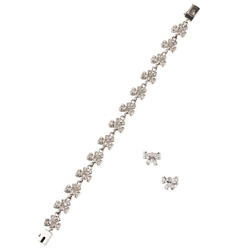 DEMI PARURE CON MOTIVO A FIOCCHI in oro bianco 18kt, composta da bracciale e paio di orecchini a forma di piccoli fiocchi impreziositi da diamanti taglio brillante per ct 1.50 circa, lungh. bracciale cm 17, dim. orecchini cm 1x1 circa, chiusura a farfallina, gr. 26 complessivi