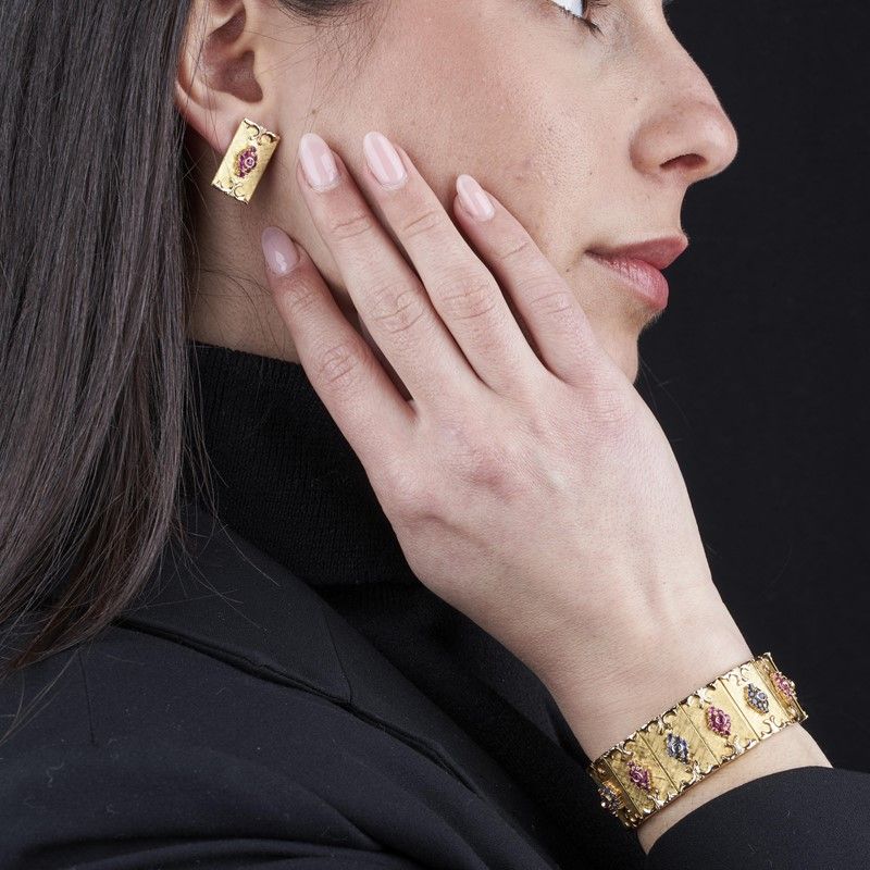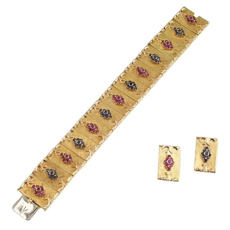 in oro giallo 18kt, composta da bracciale e paio di orecchini, realizzati a forma di maglie rettangolari con superficie satinata cinte da un motivo a volute, recanti al centro gruppi di zaffiri e rubini taglio rotondo per ct 3 circa, punzoni 750 e del fabbricante, lungh. cm 17, dim. orecchini cm 1,5x2 circa, chiusura a farfallina, gr. 60 complessivi