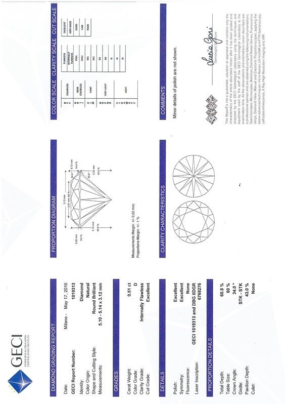 taglio brillante, di ct 0.51, colore D, purezza IF. Corredato di certificato GECI del 17/05/2016 attestante le caratteristiche.