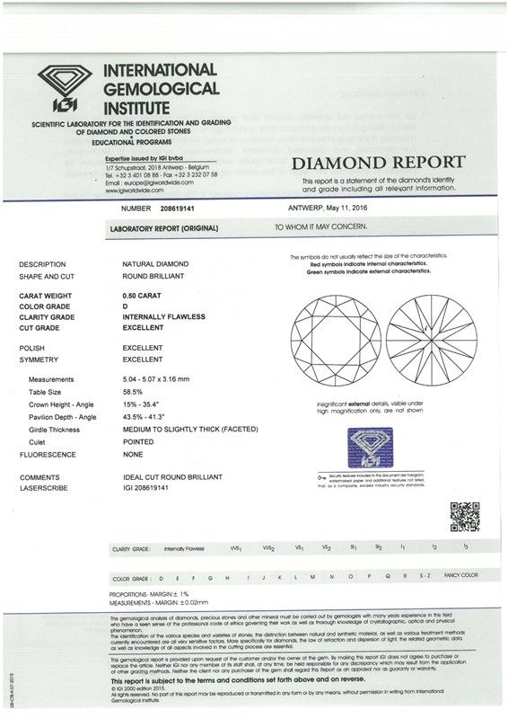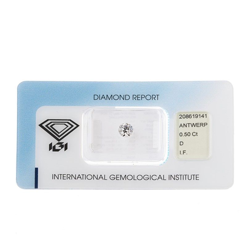 taglio brillante, di ct 0.50, coloreD, purezza IF. Corredato di certificato IGI Anversa del 11/05/2016 attestante le caratteristiche.