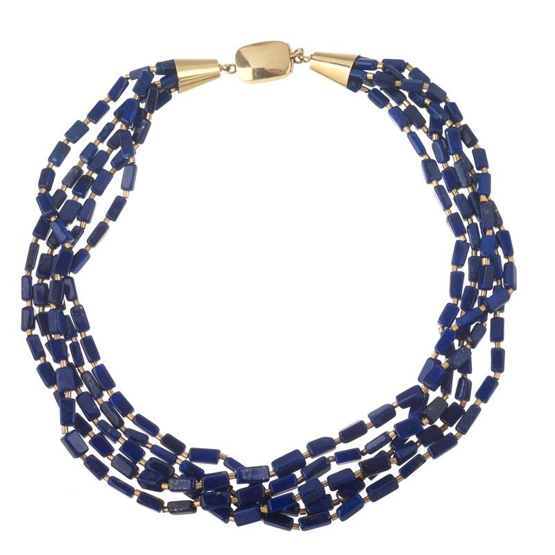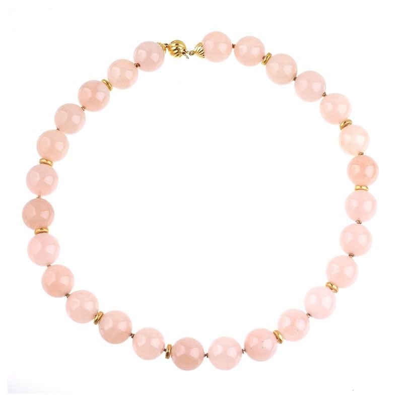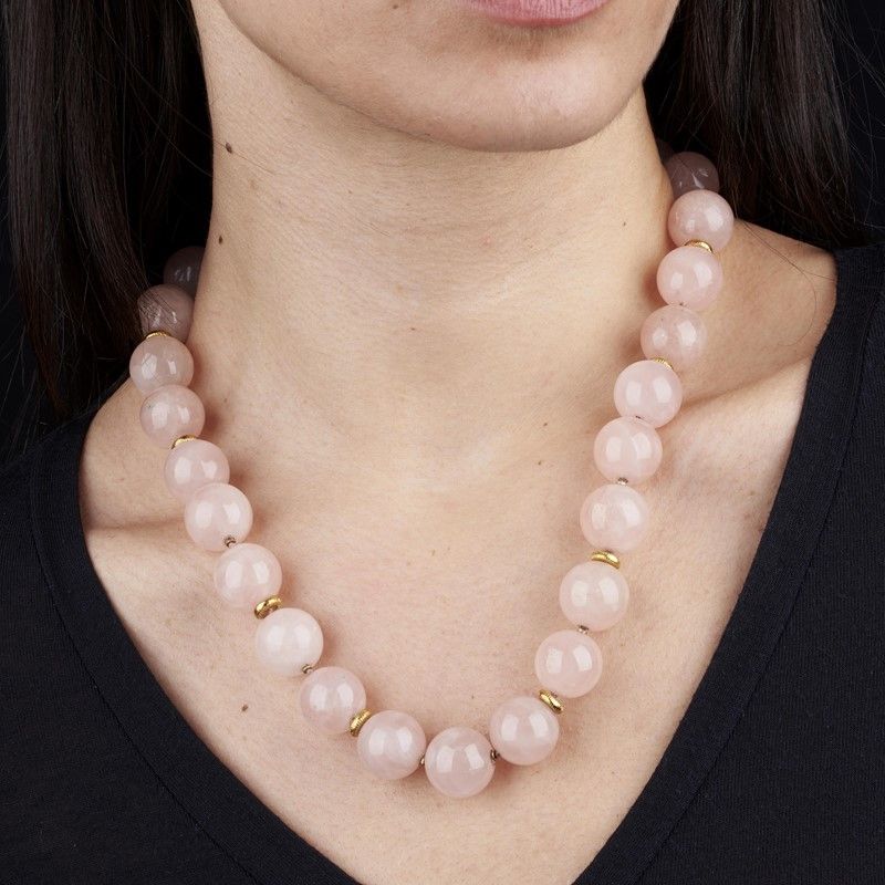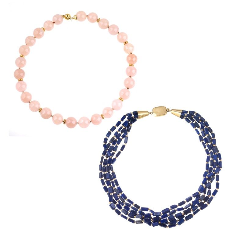DUE COLLANE CON PIETRE SEMIPREZIOSE di cui una con sfere in quarzo rosa, fermaura e distanziali in oro giallo 18kt, punzone 750, lungh. cm 51,5; accompagnata da una seconda collana a cinque fili di cilindri in lapislazzuli di mm 10x4 circa, fermatura e distanziali in oro giallo 18kt, lungh. cm 49,5, gr. 297 complessivi circa