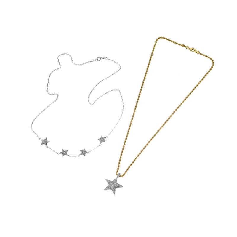 di cui una in oro bianco 18kt, composta da catena e cinque pendenti a forma di stelle impreziosite da diamanti taglio brillante per ct 0.20 circa, punzoni 750 e del fabbricante, lungh. cm 45; accompagnata da una seconda collana in oro giallo 18kt, a maglia torchon, con pendente in oro bianco a forma di stella, impreziosito da diamanti taglio brillante per ct 0.70 circa, punzoni 750 e del fabbricante, lungh. cm 40, gr. 9 complessivi