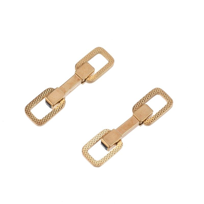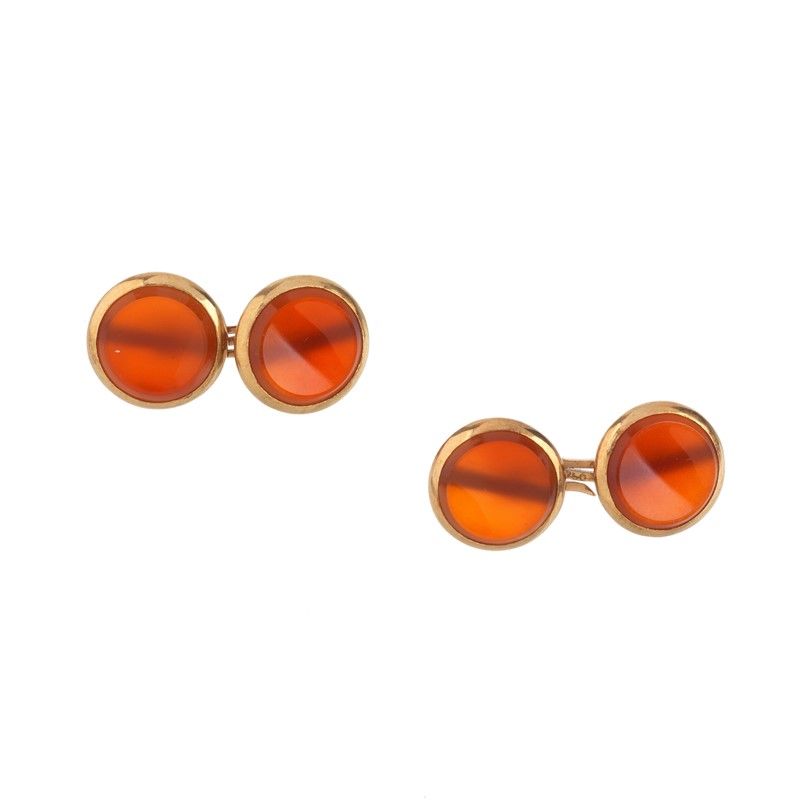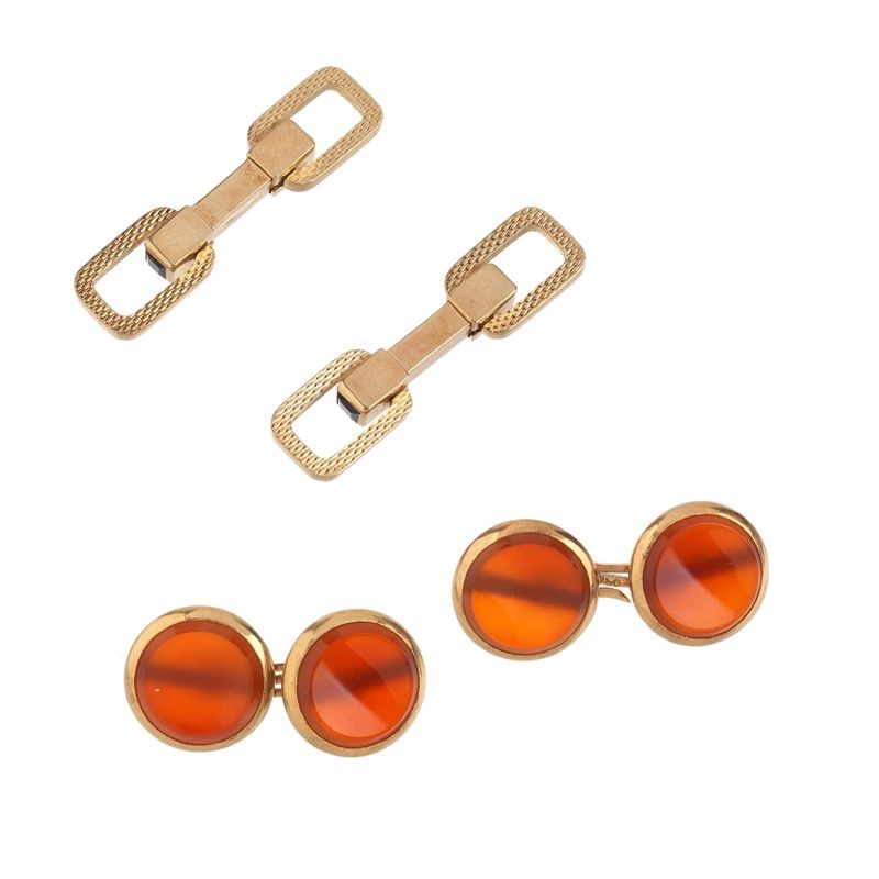 DUE PAIA DI GEMELLI in oro giallo 18kt, di cui uno a dischi zigrinati, punzoni 750 e del fabbricante, dim. cm 1x4 circa; accompagnato da un secondo paio di gemelli con elementi circolari in corniola, punzone 750, dim. cm 1x3 circa, gr. 24 complessivi circa