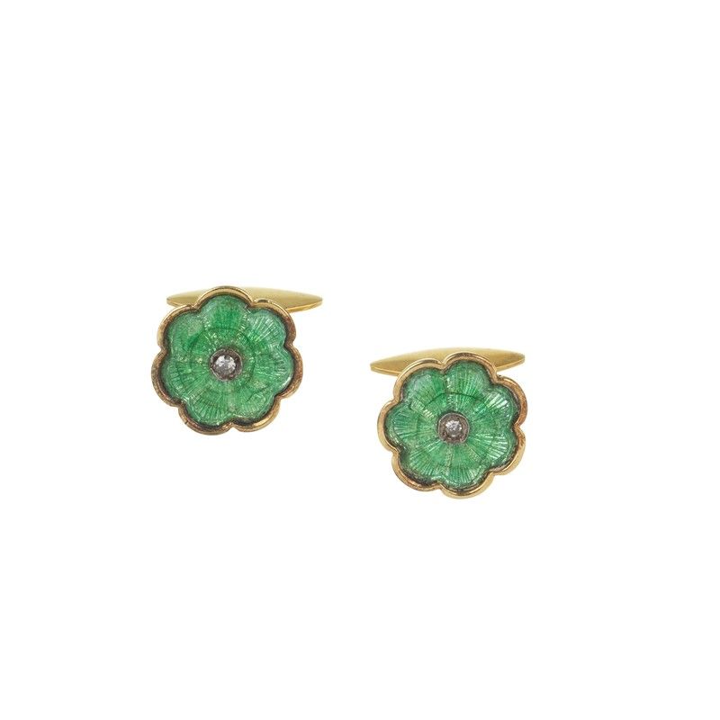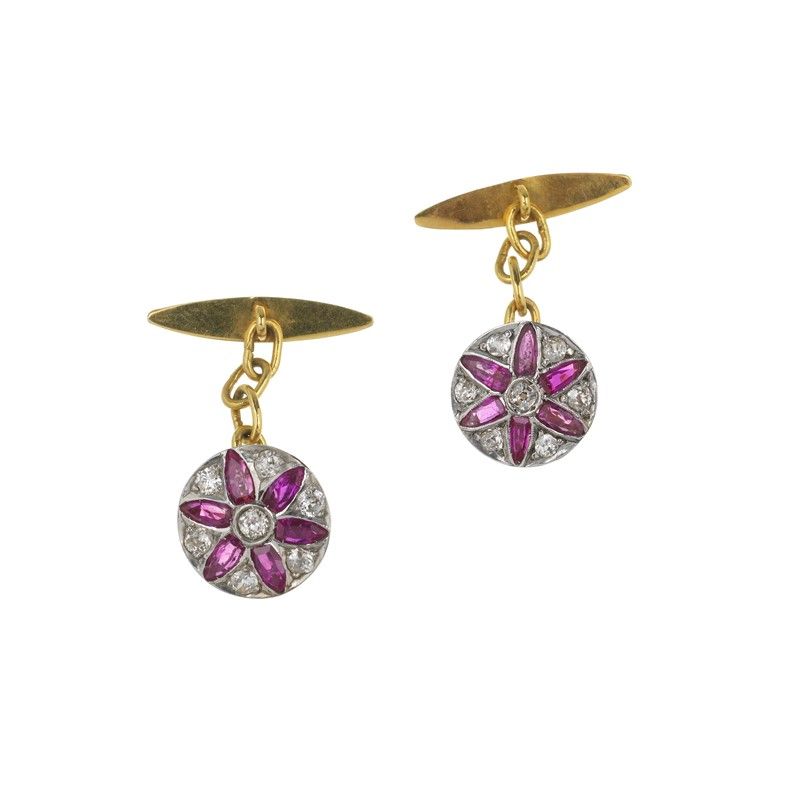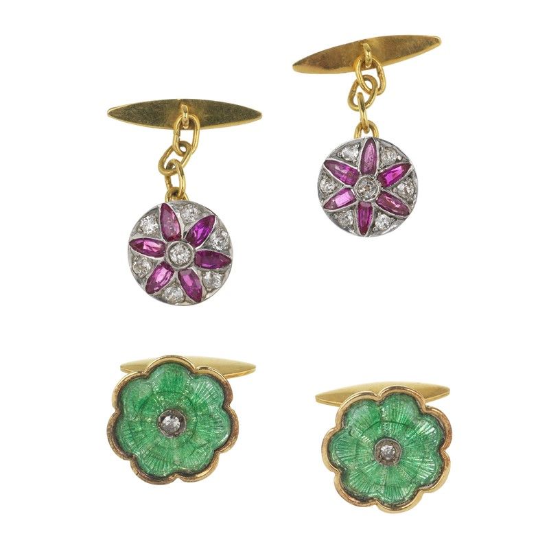 DUE PAIA DI GEMELLI MOTIVO FLOREALE in oro e argento, raffiguranti motivi floreali, di cui uno impreziosito da rubini taglio fantasia e diamanti taglio vecchio per ct 0.50 circa, dim. cm 1x2 circa; accompagnato da un secondo paio di gemelli decorati in smalto verde, punzone 750, dim. cm 1,5x1,5 circa, gr. 15 complessivi
