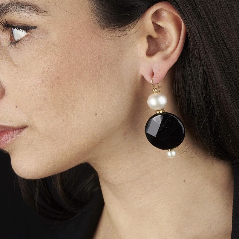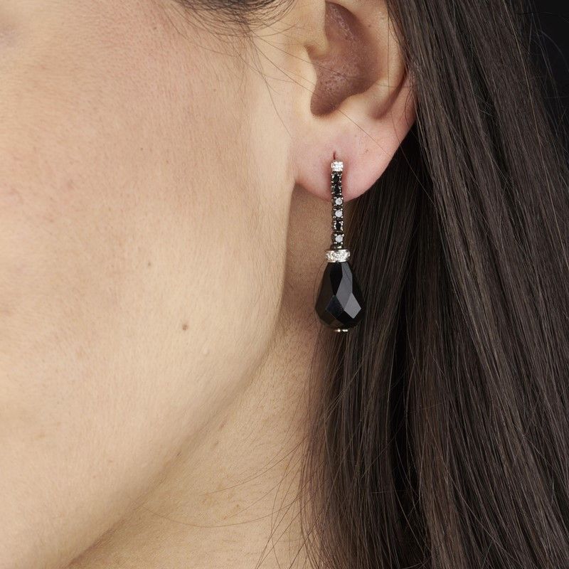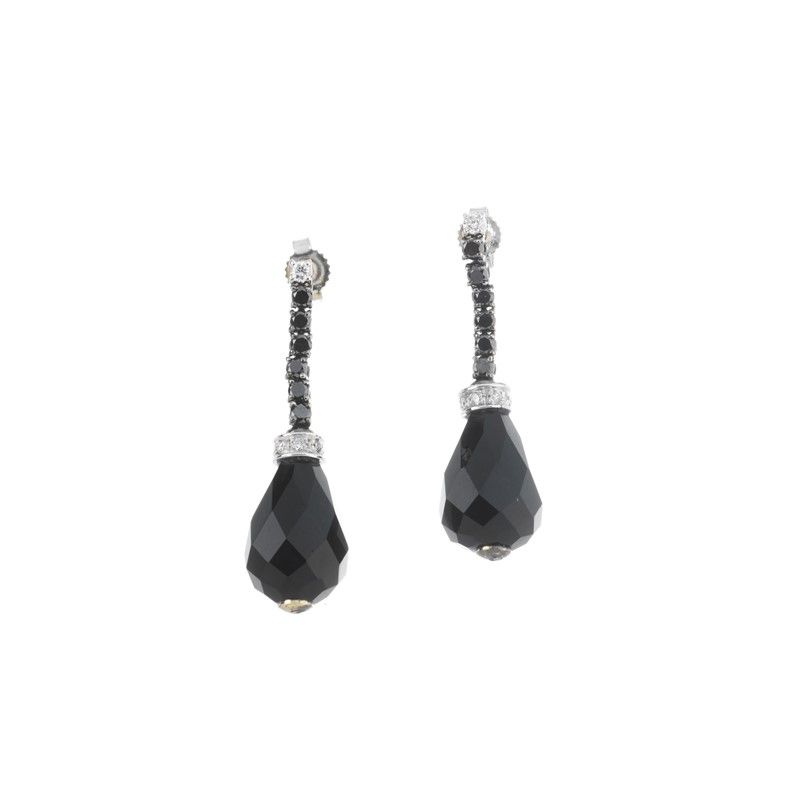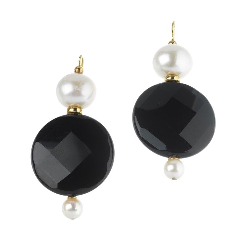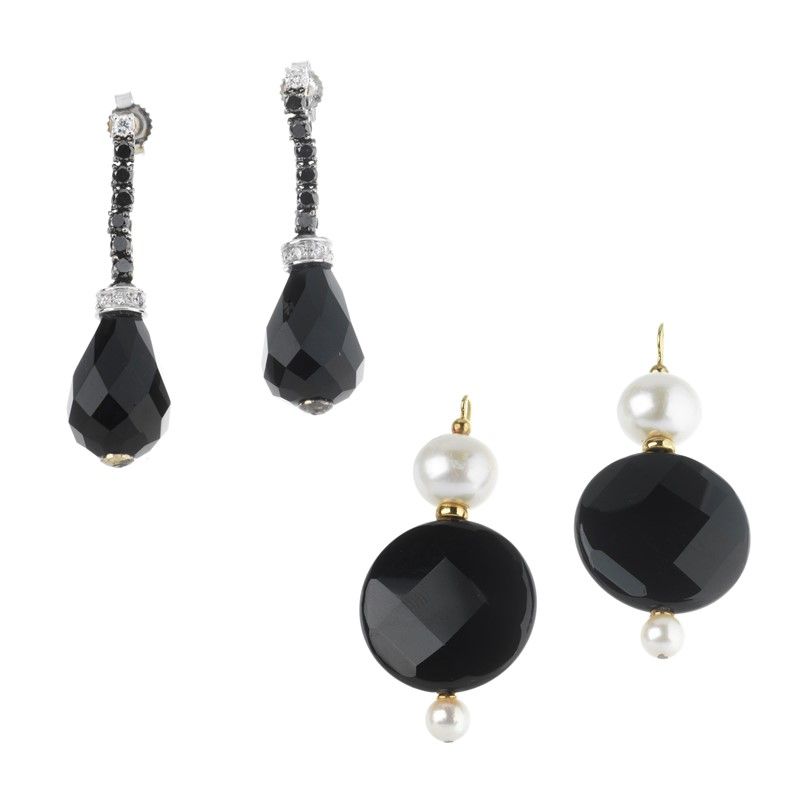 di cui un paio in oro giallo 18kt, composto da perle di mm 15 circa e mm 7 circa, con grandi dischi in pietra nera di diam. cm 3 circa, lungh. cm 3x6,5, chiusura a gancio; accompagnato da un secondo paio di orecchini in oro bianco 18kt, impreziositi da una fila di diamanti taglio brillante, da cui pendono due gocce sfaccettate in pietra nera, chiusura a farfallina, punzone 750, lungh. cm 3,5, gr. 40 complessivi circa