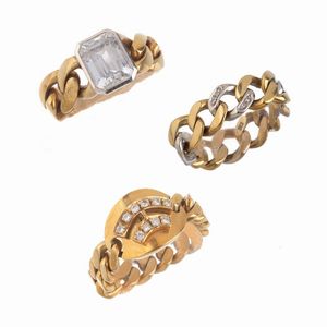 LOTTO COMPOSTO DA TRE ANELLI A MAGLIA GROUMETTE di cui uno in oro giallo e bianco 18kt con piccoli diamanti taglio [..]