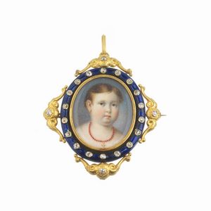 SPILLA/PENDENTE CON MINIATURA in oro giallo 18kt, realizzata a forma di quadro, decorata in smalto blu e impreziosita [..]