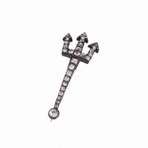 SPILLA A FORMA DI TRIDENTE in oro e argento, impreziosita da diamanti taglio antico per ct 1 circa, dim. cm 1,5x4,5, [..]