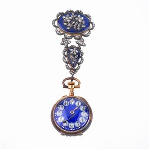 SPILLA CON OROLOGIO in oro e argento, composta da elementi pendenti impreziositi da rose di diamante e decorata [..]