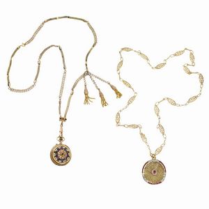 DUE LUNGHE COLLANE di cui una composta da catena in oro a basso titolo di gr. 18 e orologio da tasca in metallo [..]