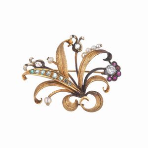 SPILLA A TRALCIO FIORITO in oro a basso titolo, impreziosita da smeraldi, rubini, microperle e un diamante taglio [..]