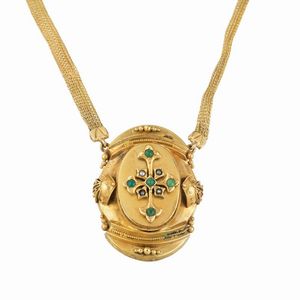 COLLANA CON PENDENTE STILE EGIZIANO in argento, da cui pende un ciondolo in oro a basso titolo e argento, raffigurante [..]