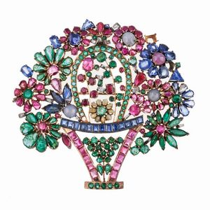GRANDE SPILLA A FORMA DI CESTO FIORITO CON PIETRE DI COLORE in oro e argento, impreziosito da varie pietre di [..]
