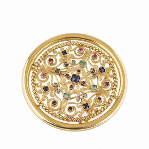 FIBBIA ROTONDA CON PIETRE DI COLORE in oro giallo 18kt, con parte centrale traforata e impreziosita da pietre [..]