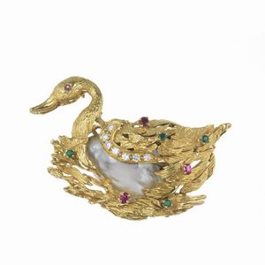 SPILLA A FORMA DI CIGNO in oro giallo, impreziosita da una grande perla barocca centrale e da rubini, smeraldi [..]
