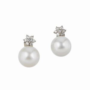 PAIO DI ORECCHINI CON PERLE SOUTH SEA E DIAMANTI in oro bianco 18kt, composti da perle south sea di mm 14 circa, [..]