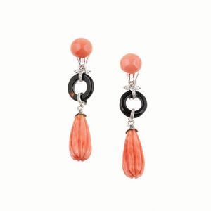 PAIO DI LUNGHI ORECCHINI PENDENTI CON ONICE E CORALLO ROSA in oro bianco 18kt, composti da elementi in corallo [..]