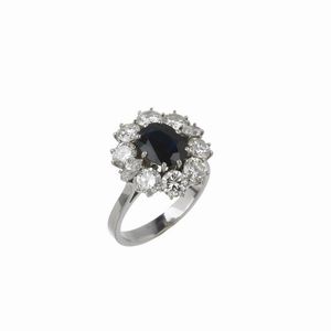 ANELLO A MARGHERITA CON ZAFFIRO E DIAMANTI in oro bianco 18kt, con al centro uno zaffiro taglio ovale di ct 1.80 [..]