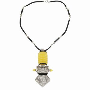 COLLANA CON GRANDE PENDENTE in tessuto nero con parti e fermatura in oro bianco 18kt e onice, da cui pende un [..]